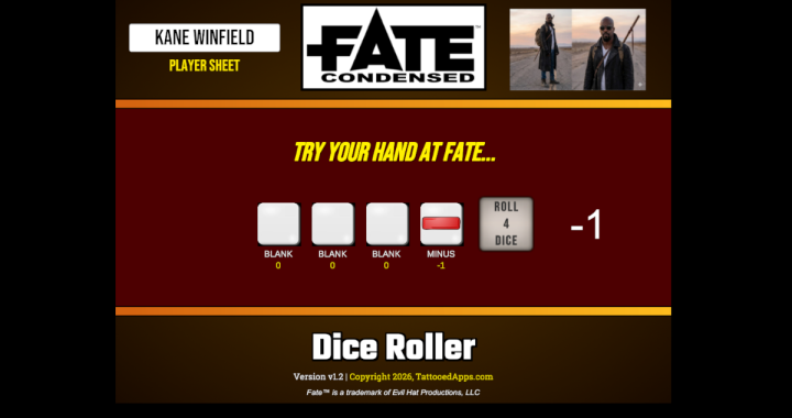 We are currently completing the last few features of version 1.2 of Fate Dice. This version will include Character Name, Character Image, Player Sheet, and some other minor features.